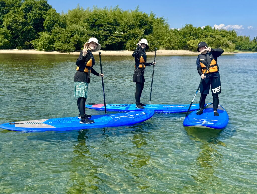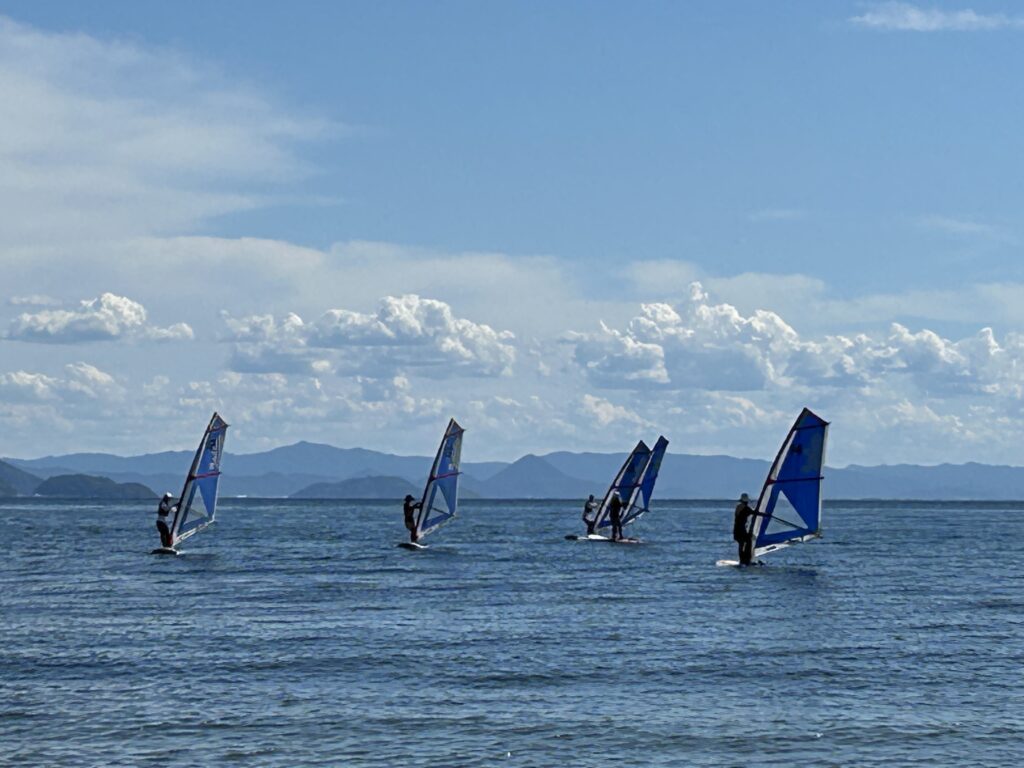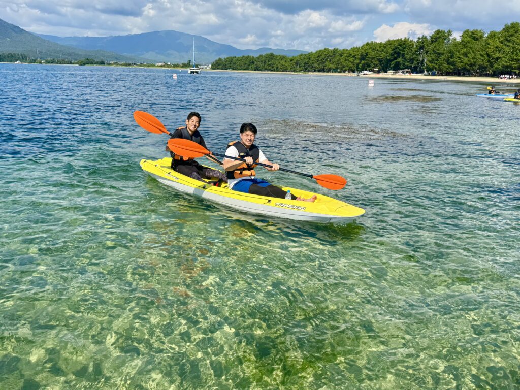 マリンでは,滋賀県の琵琶湖にて「SUP」「SUPヨガ」「ウィンドサーフィン」「カヌー」を体験。初めての体験に始めはぎこちない様子でしたが,ウィンドサーフィンではアッという間に風に乗って湖面の上を滑るようにコントロール。生涯スポーツの一つとして,ウォータースポーツの魅力を体感した授業でした。