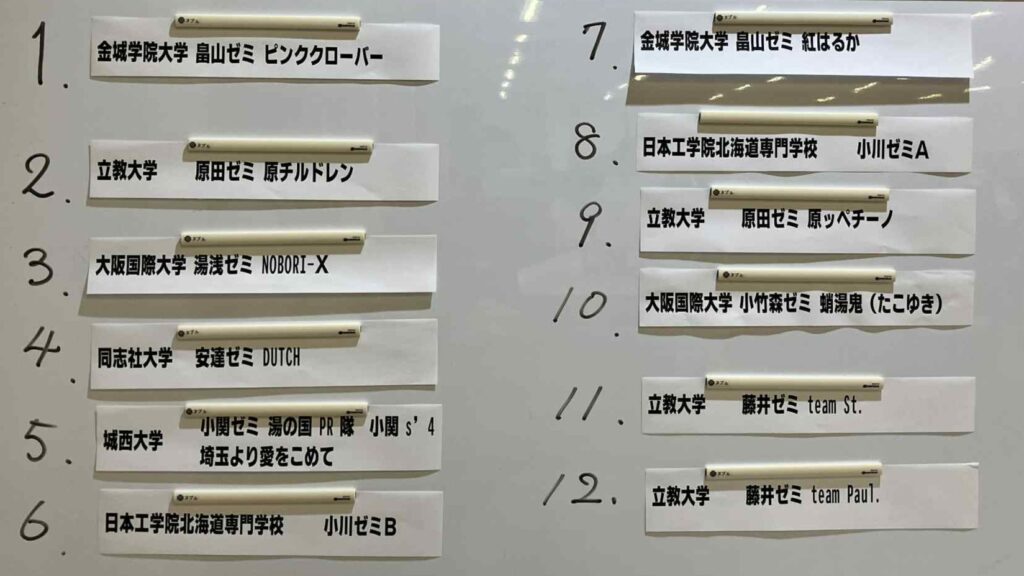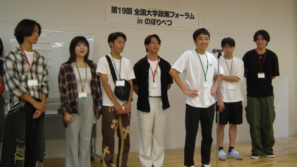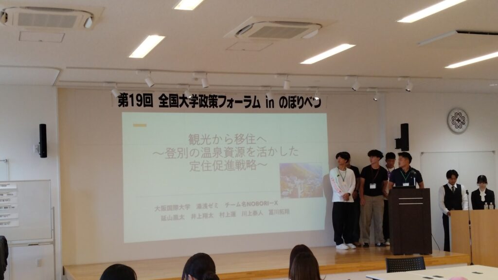 2025年9月1日(月)~3日(日)の3日間、北海道登別市において、大阪国際大学 経営経済学部 経済学科 小竹森ゼミ・湯浅ゼミ、立教大学、同志社大学、金城学院大学、城西大学、日本工学院北海道専門学校の学生12チーム64人が集い、「『消滅可能性自治体』登別、あなたならどうしますか?」というテーマで、チーム対抗の政策提言をおこないました。