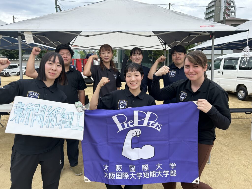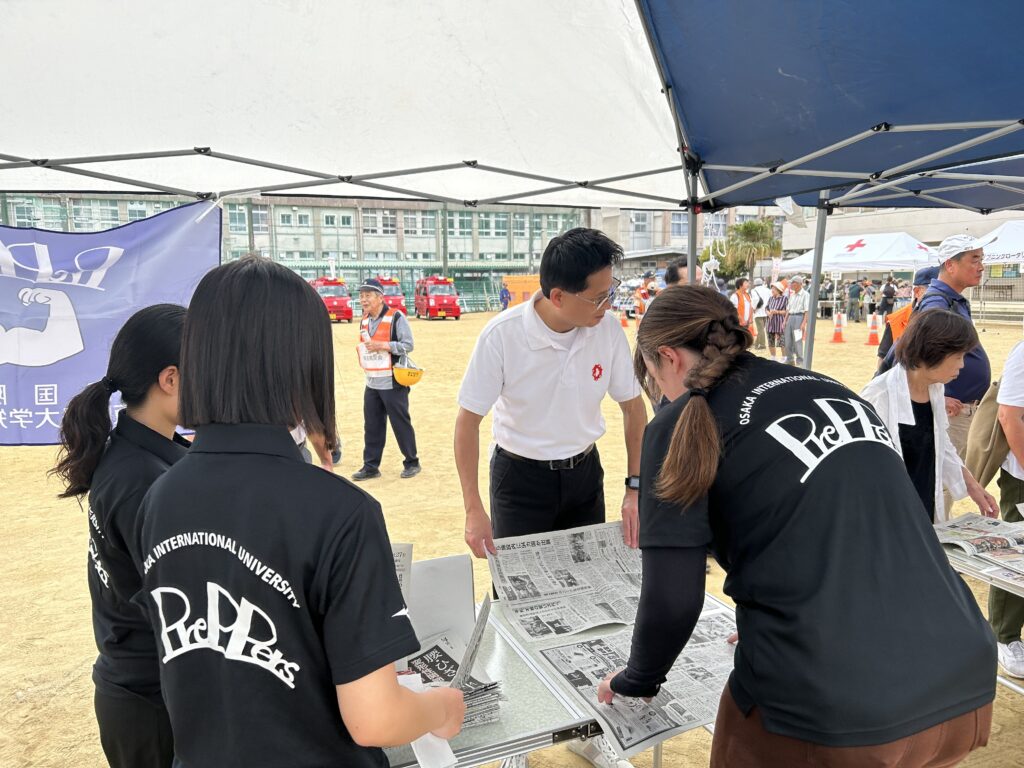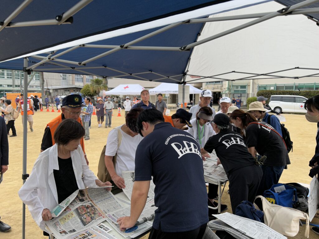 守口市危機管理室からの依頼で,9月28日(日)に守口・土居地区の自主防災訓練を守口市立第一中学校で実施しました。警察,消防,自衛隊といった公的団体やライフラインに関係のある各種企業の方々と一緒に防災に関する体験ブースとして,身近な物を使ったお役立ちグッズの紹介を行いました。