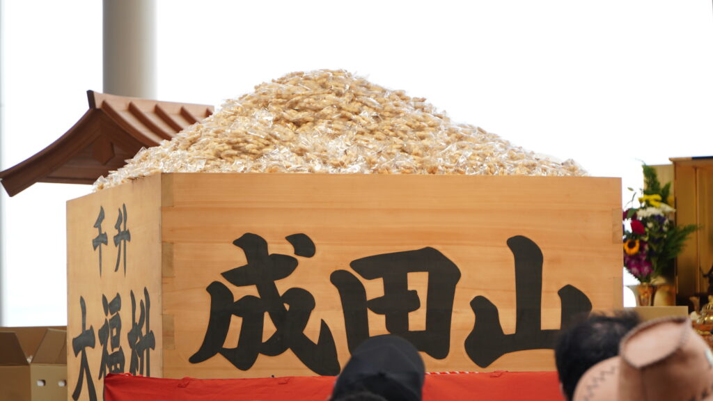 設置:本尊である不動明王像、5万袋の落花生入りのビニール袋に盛られた千升大福ます