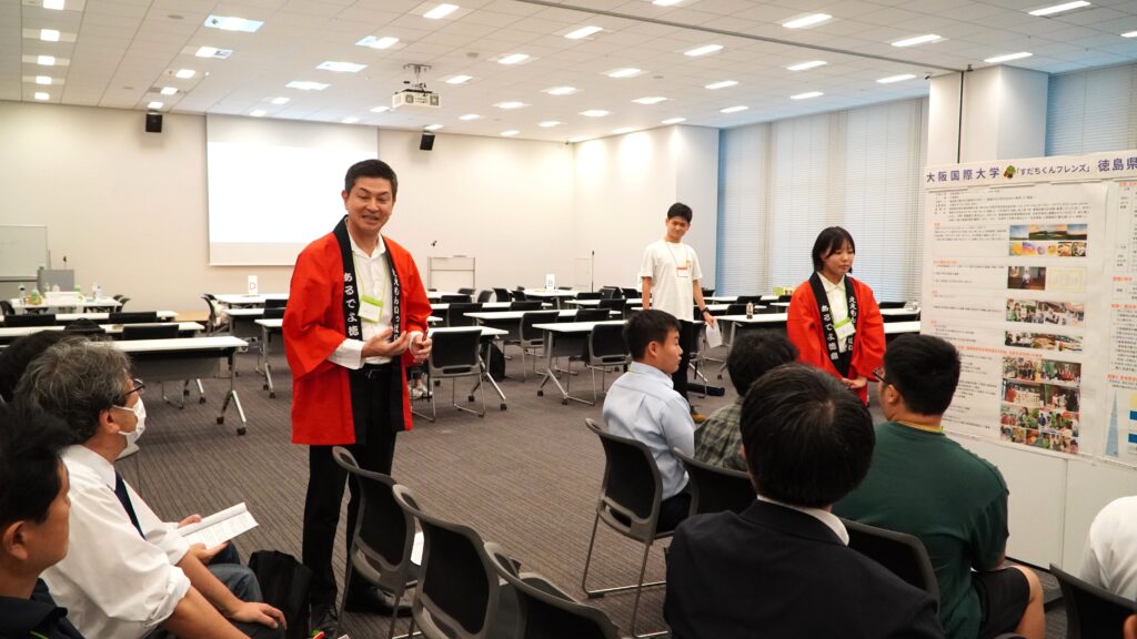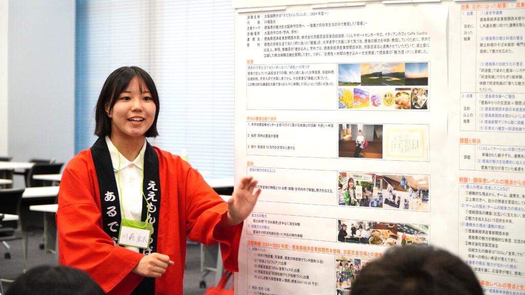 地域協働センターの学生企画で採用された「すだちくんフレンズ」の代表が、大学コンソーシアム大阪「地域連携 学生フォーラム」において、昨年度から活動している徳島の魅力普及活動の成果発表を行い、参加された他大学の方々から高い評価と賞賛のお声をいただきました。当日は徳島県経済産業部関西本部の副本部長池内様も応援に駆けつけてくださり、コメントもいただきました。