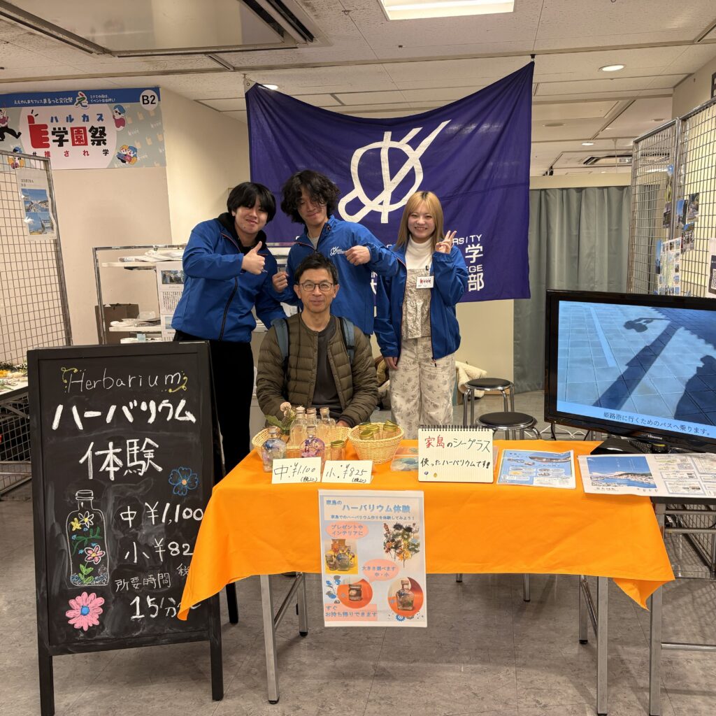 さらに、家島の海岸で学生自身が収集したシーグラスを用いた ハーバリウム体験ワークショップ も実施し、子どもから大人まで幅広い来場者に参加していただきました。参加者には、手作り作品を通じて家島の魅力に触れていただく機会となりました。