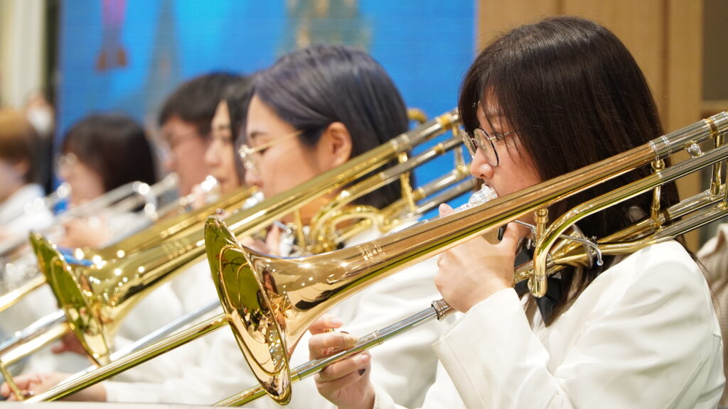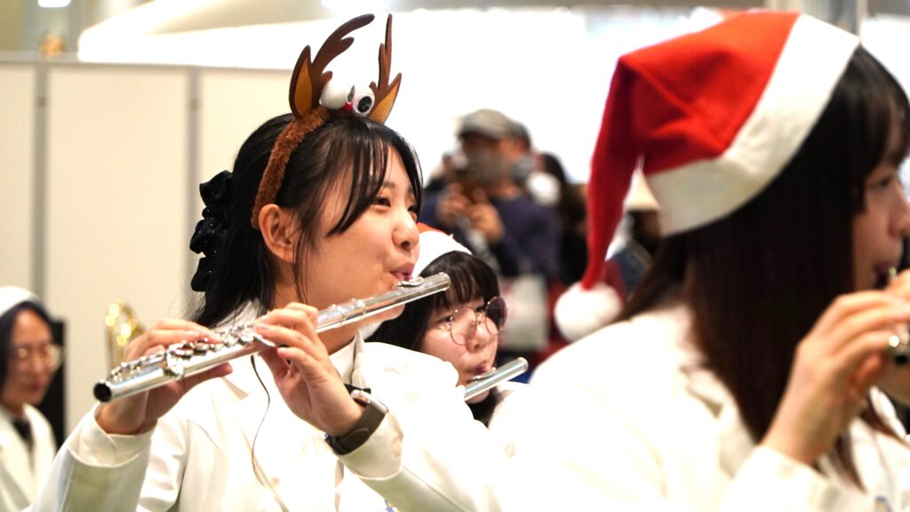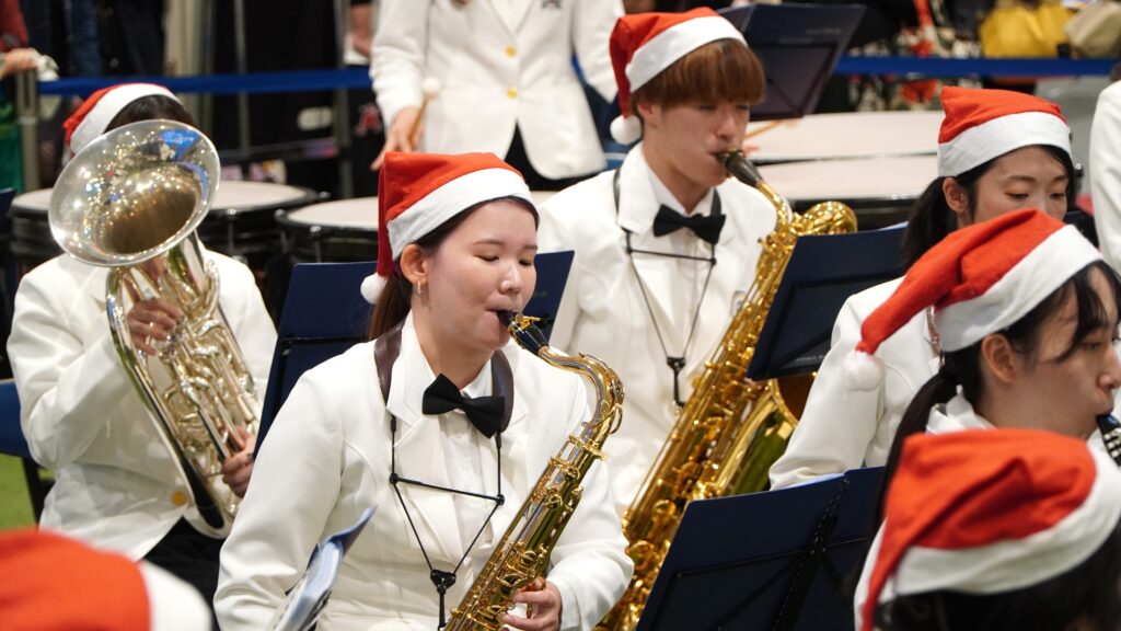 リトルマーメイドメドレーやアンパンマンマーチ、サザエさんなど親しみやすい曲や、クリスマスソングをスウィングにアレンジした曲では、学生たちがサンタクロースの帽子やトナカイのカチューシャをつけ、クリスマス気分満点の演奏に大きな拍手を送っていただきました。