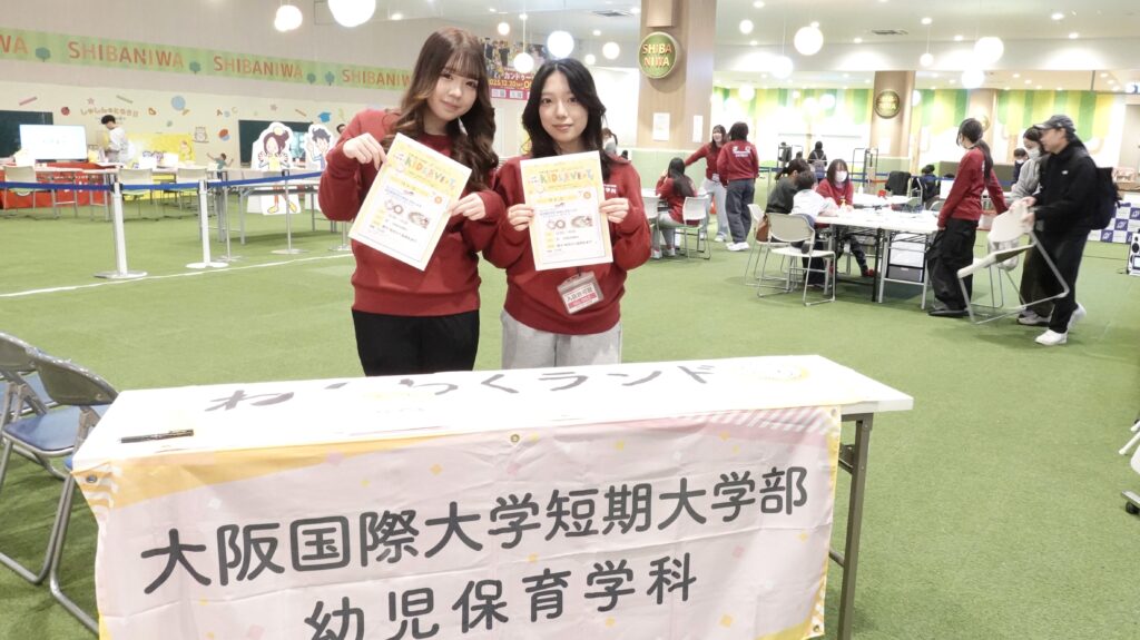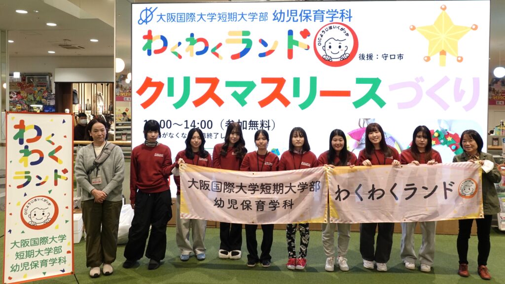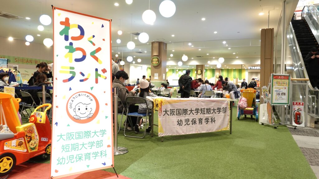 大阪国際大学短期大学部幼児保育学科では、自治体との連携による地域連携で取り組む子育て支援活動「わくわくランド」を開催しています。この活動の趣旨は、京阪沿線で数少ない保育者養成校である本学が、自治体と連携して、地域の若者を育て、地域の園に還すという「子育て基盤づくり」にあります。イオンモール大日では今年度3回目となる幼児保育学科の「わくわくランド」を守口市の後援により開催しました。