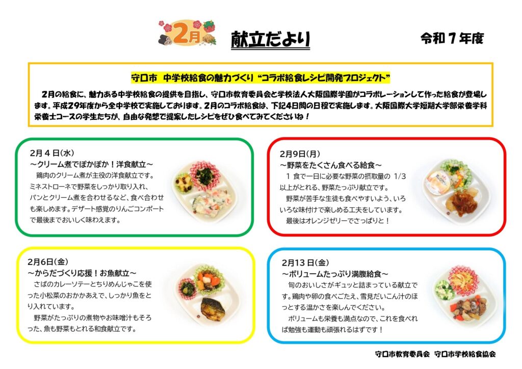 レシピ4食は2月の4日間で約2,000食が守口市内の全中学校(7校)へ提供され、今回、参画した学生が中学生と喫食してお互いに感想を語り合いました。