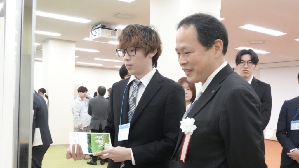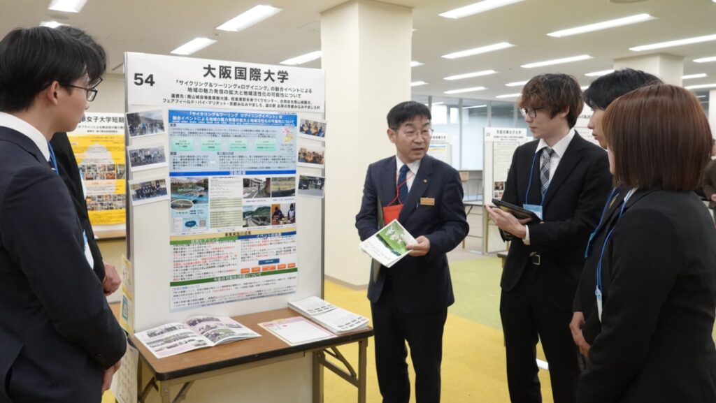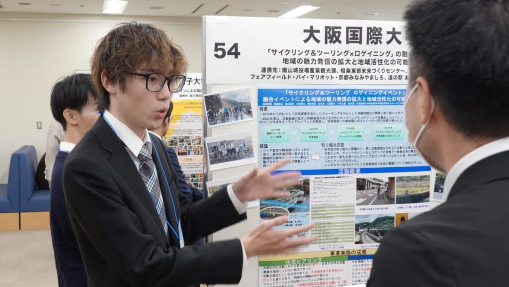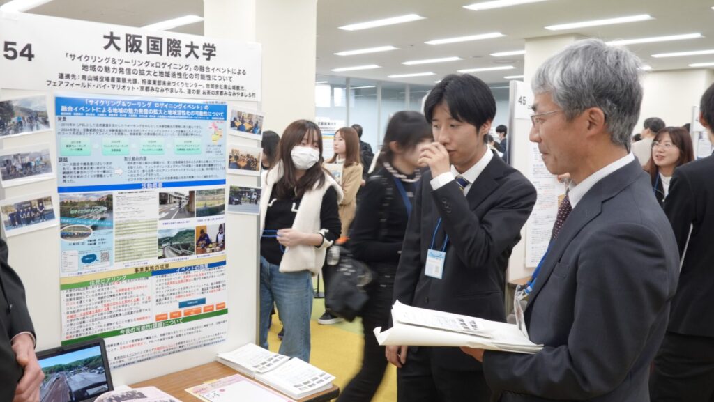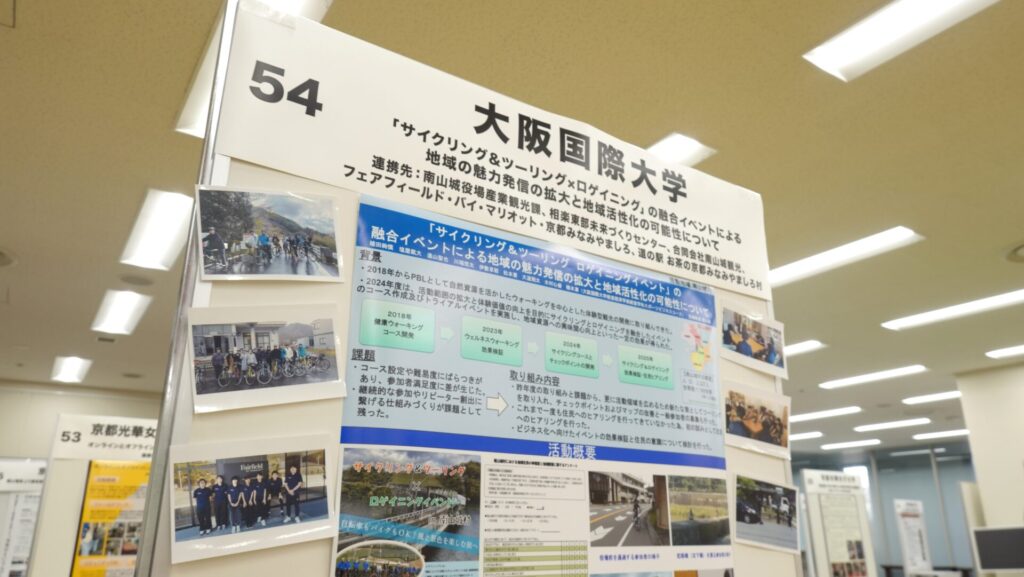 この報告会は京都府の補助金を採択された大学による取り組みや成果を発表する場で、コロナ禍が終息した2023年から対面・集合形式で開催されています。各大学の教職員だけでなく、京都府知事や行政関係者、企業の関係者と多くの参加者が集い意見交換を行っています。今年度の報告会は、経営学科スポーツビジネスコース4年(横山ゼミ)の学生がポスター発表を行い、鈴木一弥京都府副知事をはじめ多くの方に2年間の取り組みと成果を報告し意見交換することができました。