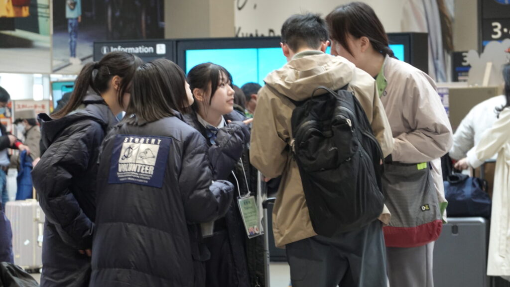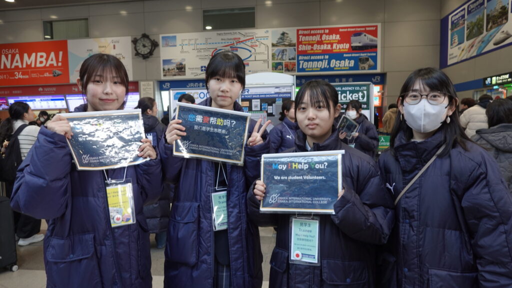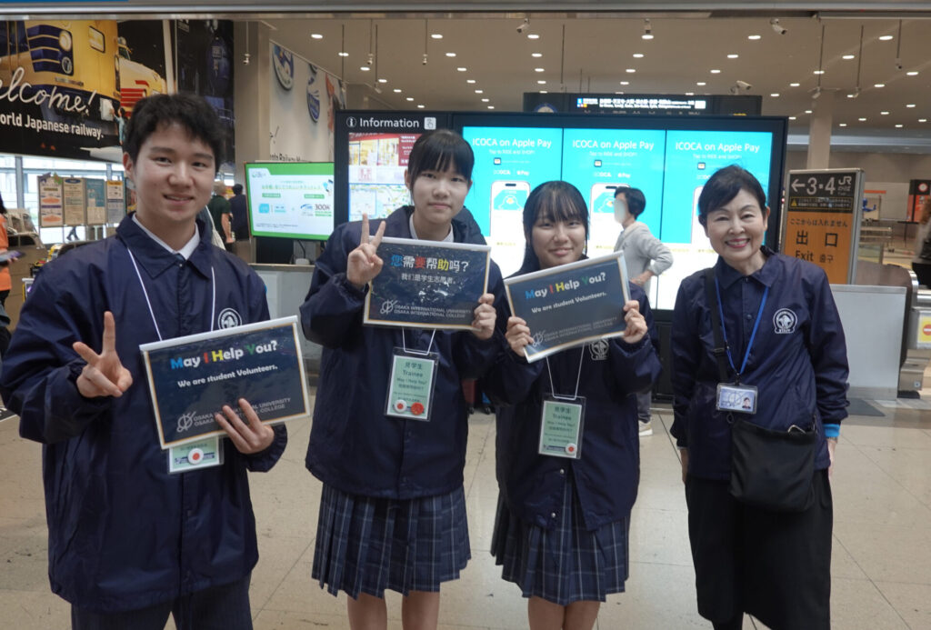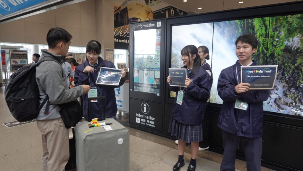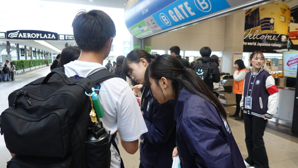 その後は世界各国から多くの旅行者が訪れるJR関西空港駅で、外国人旅行者への案内や駅構内でのサポートを通して、語学を実践しながら笑顔で交流。初めは緊張していた高校生も、大学生リーダーのサポートを受けながら活動を重ねるうちに積極的に話しかける姿が見られました。多文化が行き交う環境で世代をこえて学び合うこの活動は、高大連携を深め、国際感覚を育む貴重な機会となりました。
