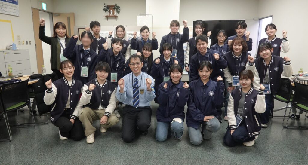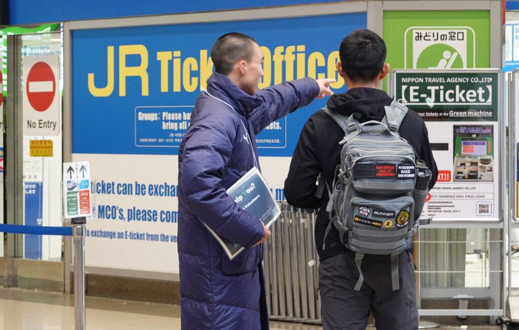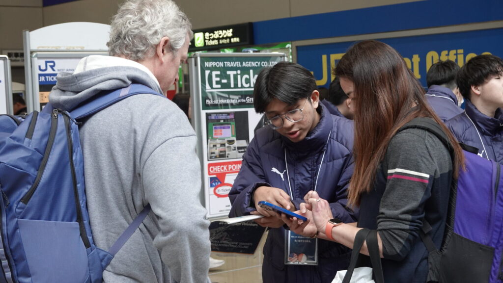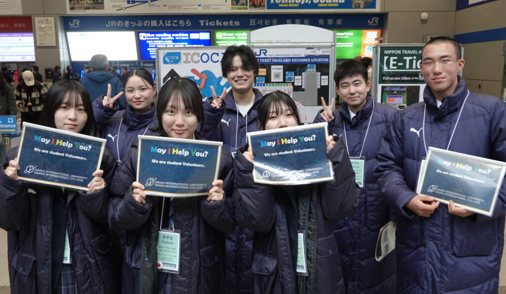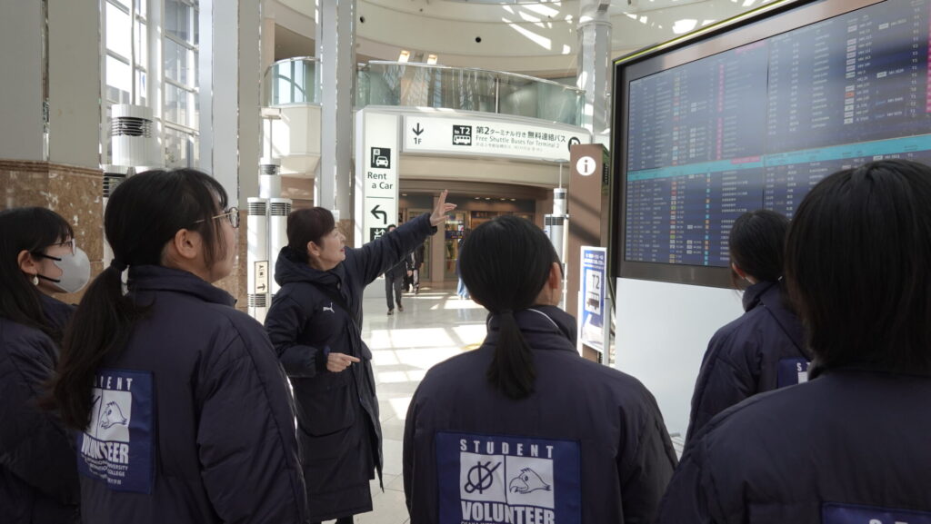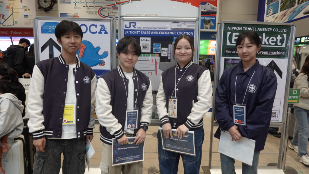 その後は世界各国から多くの旅行者が訪れるJR関西空港駅で、外国人旅行者への案内や駅構内でのサポートを通して、語学を実践しながら笑顔で交流。初めは緊張していた高校生も、大学生リーダーのサポートを受けながら活動を重ねるうちに積極的に話しかける姿が見られました。多文化が行き交う環境で世代をこえて学び合うこの活動は、高大連携を深め、国際感覚を育む貴重な機会となりました。