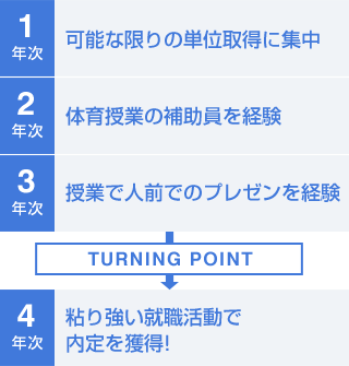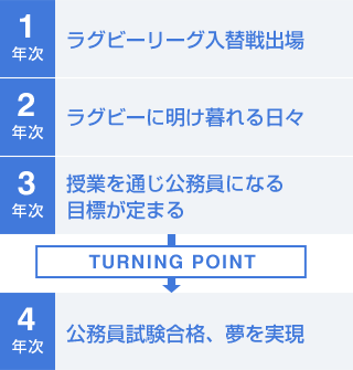 入学当初は漠然と、公務員という夢を持っていました。その夢が具体的な目標に変わったのが、「まちづくり論」と「地域防災論」の授業。より良いまちづくりを行政の立場で実現していくという、「なぜ自分は公務員になりたいのか」が確信できたことで、自然と勉強に身が入るようになりました。その結果、東京の世田谷区と大阪の役所に内定。最後まで諦めずに向かっていけば、絶対、何とかなる。周りの人も自分に熱意があれば協力してくれることが分かった4年間でした。