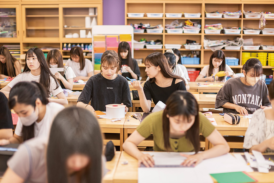 実習や演習、講義を通して保育者に必要な知識を、同じ目的を持つ仲間と一緒に楽しく学びます。なかでも「音楽」「体育」「美術」などの授業は「実践的な内容が豊富でおもしろい」と学生から好評を得ています。