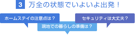 海外での生活に関わる問題は、事前研修で解決しましょう。ホームステイの家族の情報、現地での暮らしに必要なものや注意点、治安や防犯対策などセキュリティも万全にして海外生活に臨みます。またキャリアコンサルタントによる目標設定セミナーや帰国後のふりかえりワークショップなどで海外体験を就職活動や人生設計で生かします。