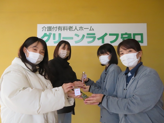 コロナ禍にあって自由に観光を楽しむことが困難な入居者様や介護者の皆様の心を和ませる、手製のハーバリウムをプレゼントしました。ハーバリウムには鹿野町の草花も入っていて、鹿野町と守口市をつないでいます。