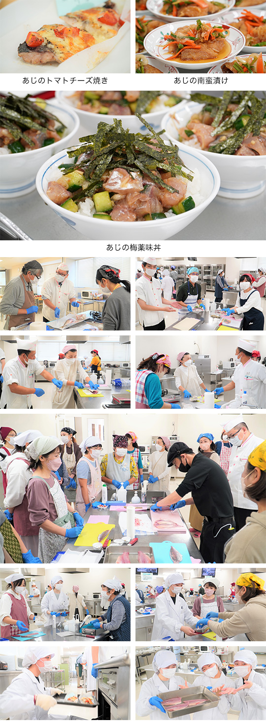 内容:お魚のさばき方の実演、あじの梅薬味丼、あじのトマトチーズ焼き、