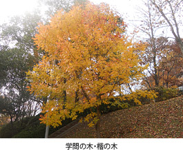 また、「楷の木」も綺麗に色づいている。この木の祖先は中国の儒学の祖である孔子の墓所で育ち、「学問の木」といわれ、「楷書」の語源とされる。大正時代に孔子の墓所から楷の木の種を採取し、大正14年に苗木が岡山県の閑谷学校へ贈られた。そしてその子孫が平成10年、大阪国際大学の開学10周年の記念樹として、閑谷学校から岡山大学を経て本学に届けられた。この木の四季折々に見せる美しい佇まい、特に秋の紅葉の姿は素晴らしい。
