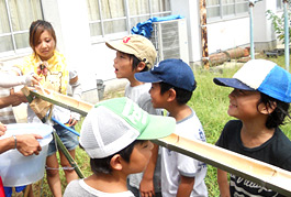 このお祭りは、大学近隣の菅原東小学校の小学生を南山城村の旧高尾小学校(廃校)に招待して、南山城村の美しい茶畑の景色や大自然を楽しみながら、村の方々や地元の小学生と学習交流を行い、村の活性化に繋げるものです。お祭りには総勢88名にご来場いただきました。午前は里山でウォークラリーを行い、都会では珍しい昆虫や植物を採集。それを村の景色や校舎の絵と一緒に写生して、旧高尾小学校内に展示しました。