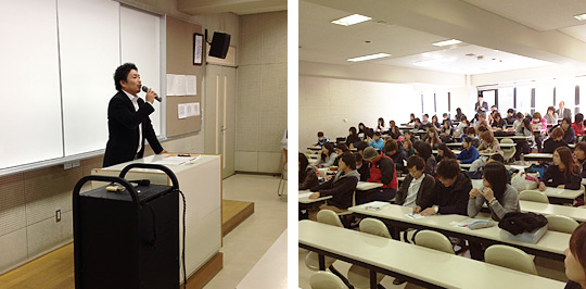 テーマは「キャリア」、「自己分析」。社会人になることの意味や働くことの意義、自己分析の必要性などワークを交えながらすすめられいる。学生は今までに就職やキャリアについて考える機会が少なかったため、新鮮な気持ちでセミナーを受け、前向きに受講している。