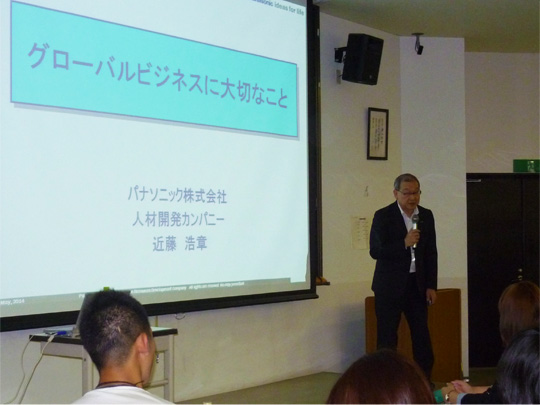 グローバルビジネス学部では、海外で活躍しているビジネスマンをお招きし、ビジネスでの体験談やグローバルビジネスの必要性についての特別講演を定期的に行います。5月28日(水)に行われた第一回目の特別講演ではパナソニック(株)人材開発カンパニーの近藤浩章氏をお招きし「グローバルビジネスに大切なこと」をテーマに講演が行われました。「自分に志と誇りを持つこと」、「文化の違いを受け入れ尊重すること」などグローバルに活躍する人材になるために何が必要か語る近藤氏の言葉に学生は聞き入り、熱心にメモを取る姿が印象的でした。