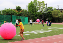 午後の「遊び」の時間は、室内では守口市社会福祉協議会が用意してくださった輪投げやコマを使って遊びました。この時間には雨も上がっていたので人工芝グラウンドも解放。子どもたちはキンボールやドッジビーを使って元気に走り回っていました。